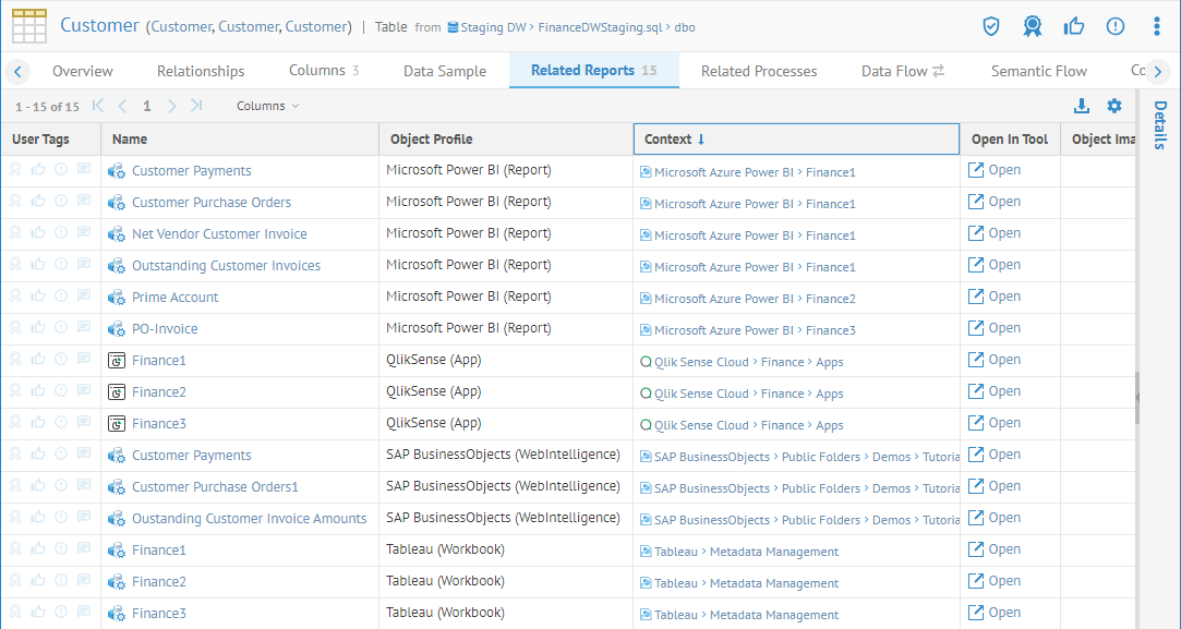 The Open option is presented for each report end point and clicking there presents the report in the third-party tool.