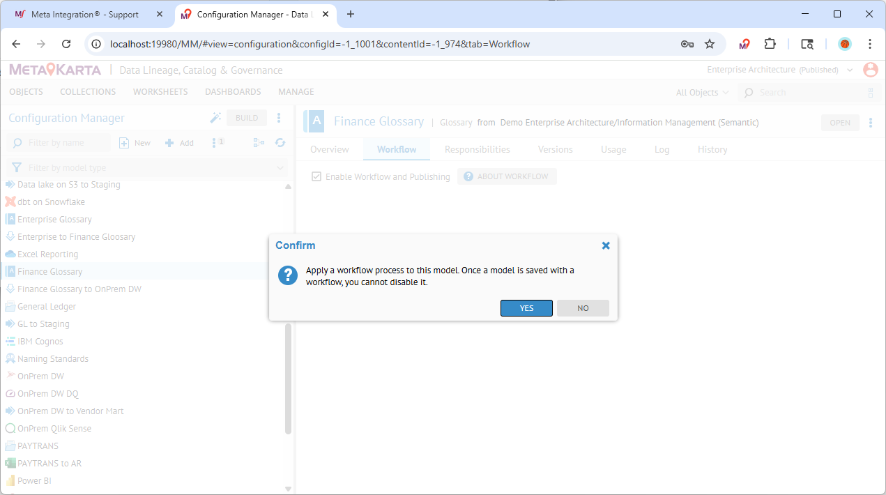 Models which may be included in a workflow, like a glossary, you also see the Workflow tab where you may turn on workflow and specify workflow options.