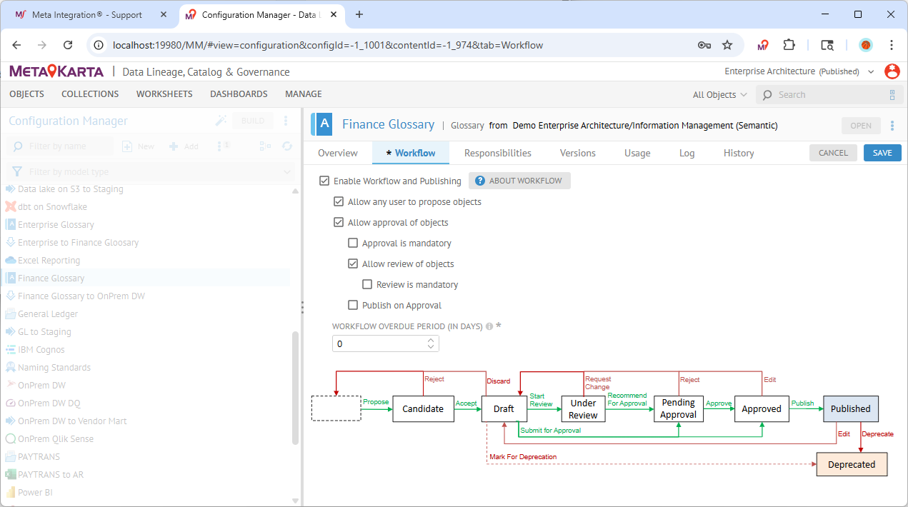 The workflow process applies to changes to objects in the glossary and their associations.