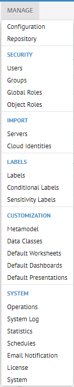 Administration and System Management The MANAGE menu in the banner provides access to the administration and system management functions.