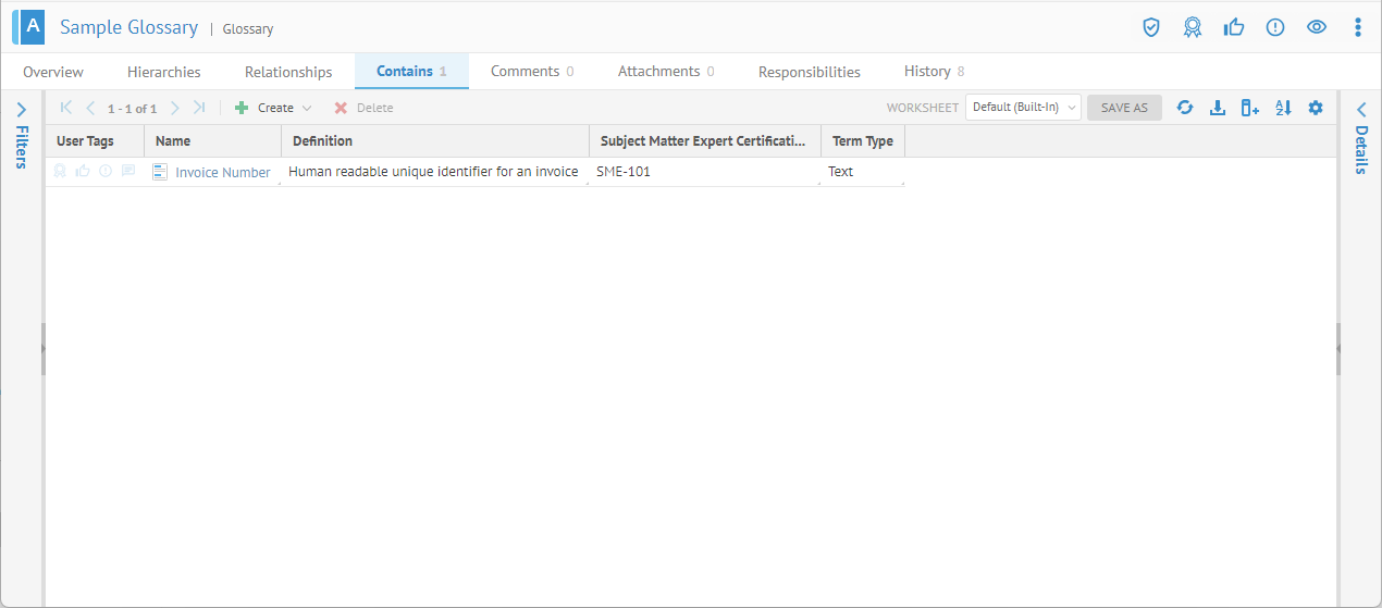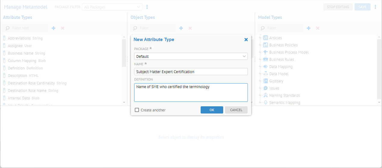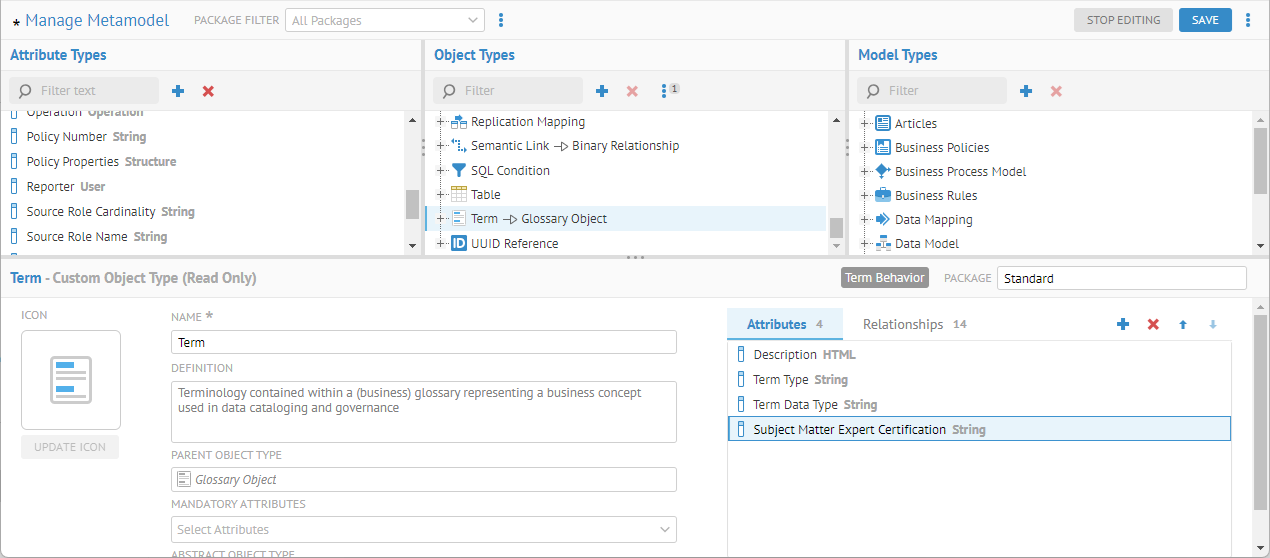 The first four fields should map into the standard Glossary Term quite well. However, the Subject Matter Expert Certification will need to be defined in the metamodel and Term should be extended to include it. Alternatively, one could create a new object type (say External Term) that inherits from Glossary > Term and also includes the new attribute. We will do the former.