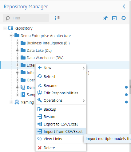 The bulk import and export is a context menu option on a folder in the repository manager. The export process produces an XLSX file per a single-model. When bulk exporting multiple models, it ZIPs their XLSX or CSV files organized by their folder hierarchy using file directories. The import process takes a ZIP file and assumes the same organizational structure as the export process.