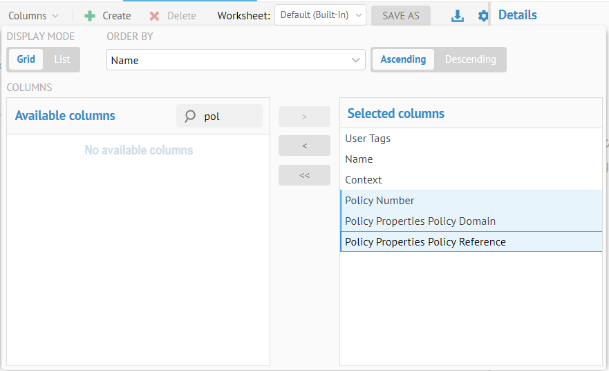Now, click MyCompany Policy in the breadcrumbs at the top and go to the Hierarchies tab and click Columns to add the various attributes defined for the business policies as shown.