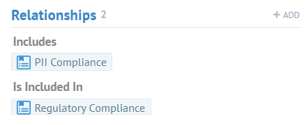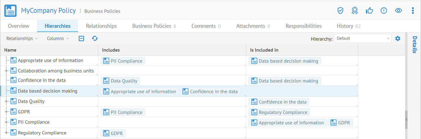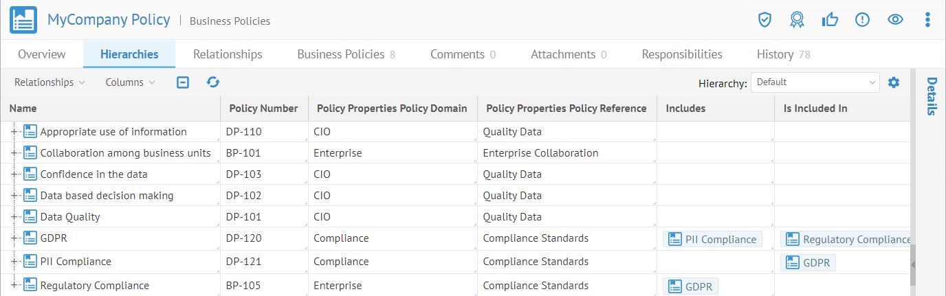 Now, this includes relationship is represented as a hierarchy so you may visualize how policies are included within others. E.g., PII Compliance is included in GDPR and also in Appropriate use of information.