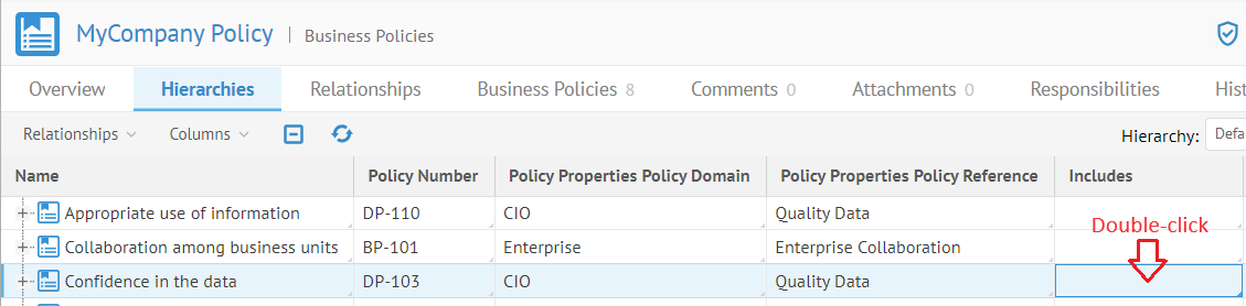 Now, we will define the rest of the relationships so that we have a complete set of policies. To add a relationship, right click where you want it and select which type you want. So, in this case, double-click in the Includes column for the row for Confidence in the Data to add an Includes relationships to this business policy.
