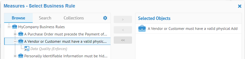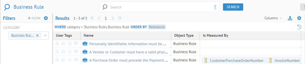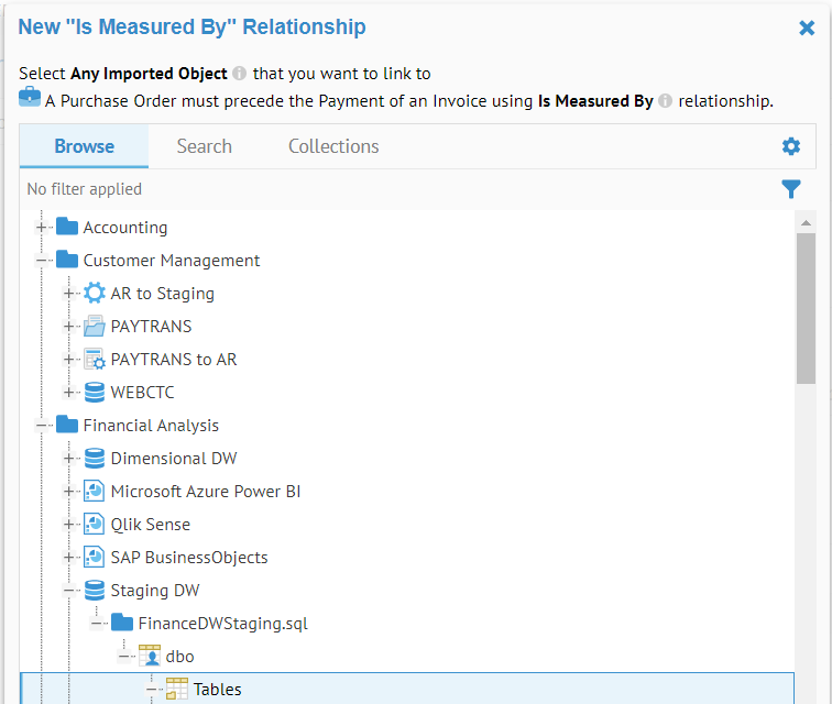 On the object page of MyCompany Business Rules, click A Purchase Order must precede the Payment of an Invoice to go to its object page and click +ADD to the right of Relationships and select is Measured By.