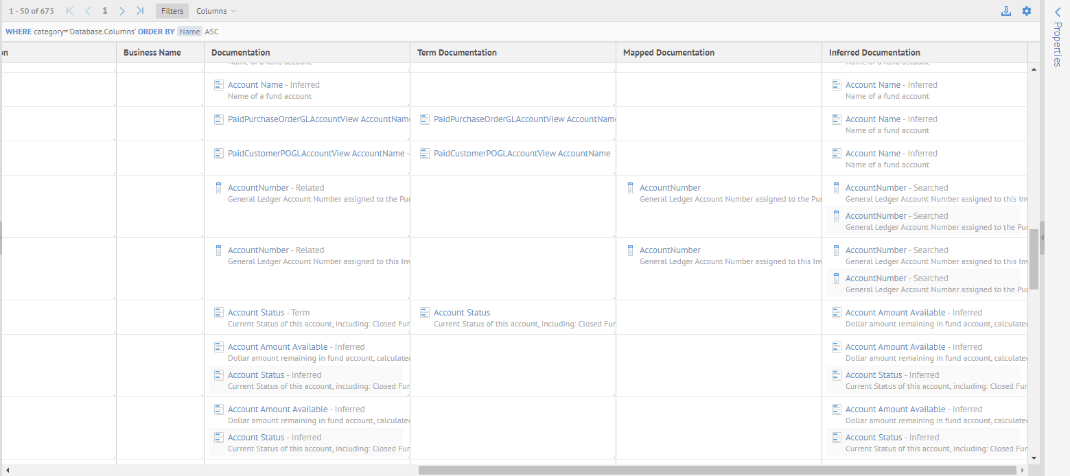 Now, you may filter on any of these additional columns to determine which columns have which type of documentation and thus what needs to be worked on.