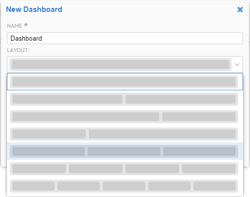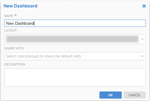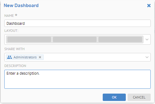 For a new dashboard, specify the Name, Layout, Sharing and Description.