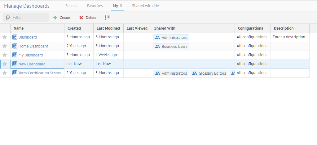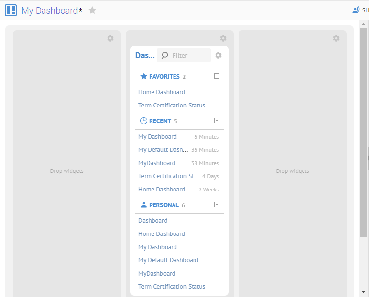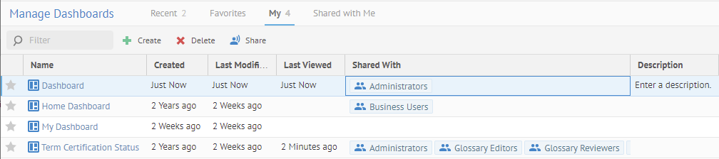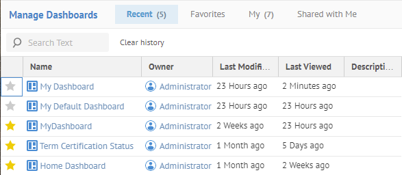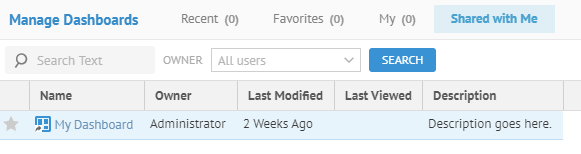 This list will be empty at first. You must search for dashboards that are shared with you.
