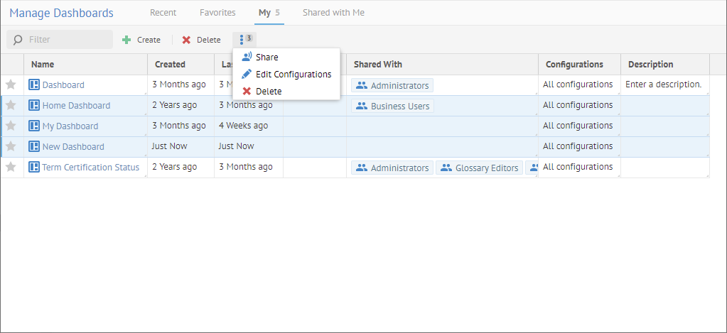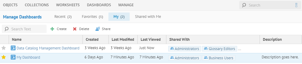 Dashboards have an owner who is the creator of the dashboard. That owner may open, edit, or remove a dashboard. The dashboards that one owns may always be found in the My tab under DASHBOARDS > Manage.