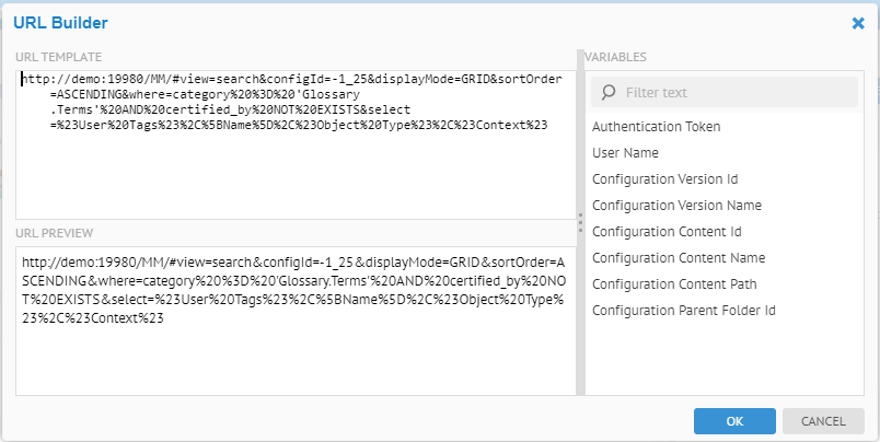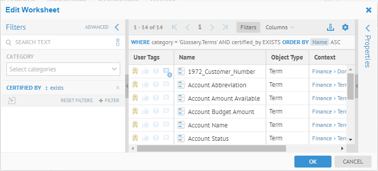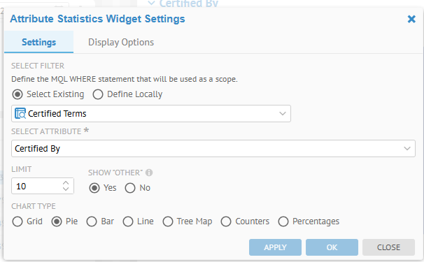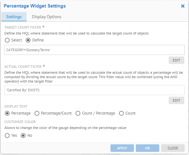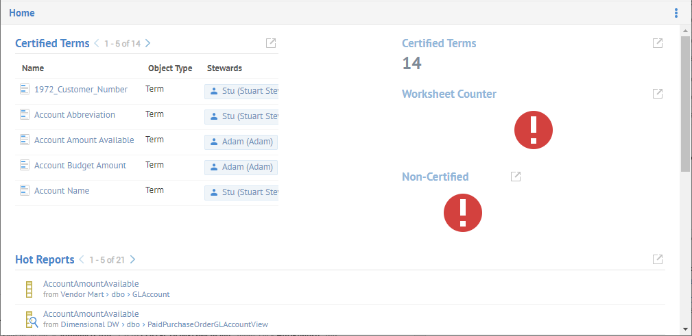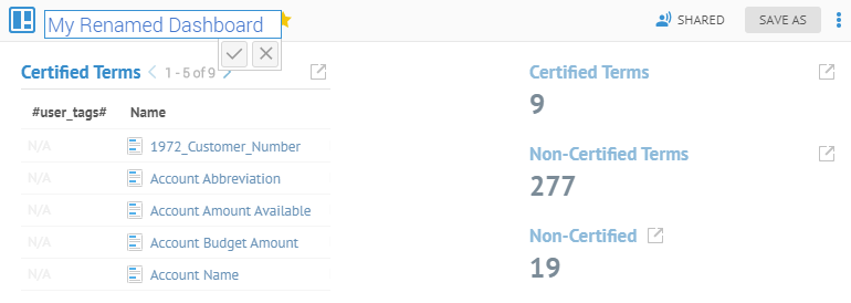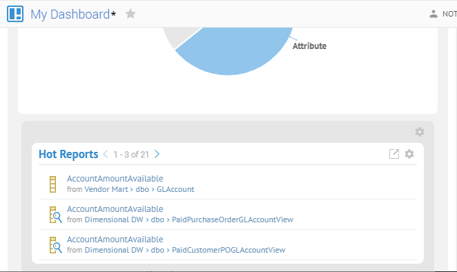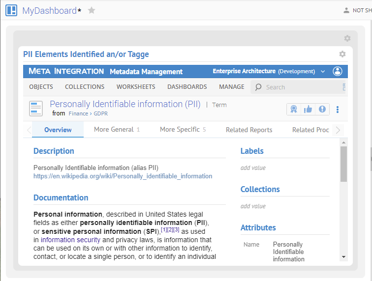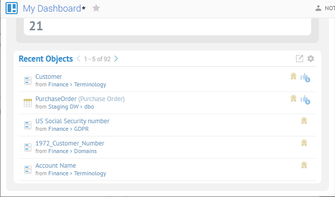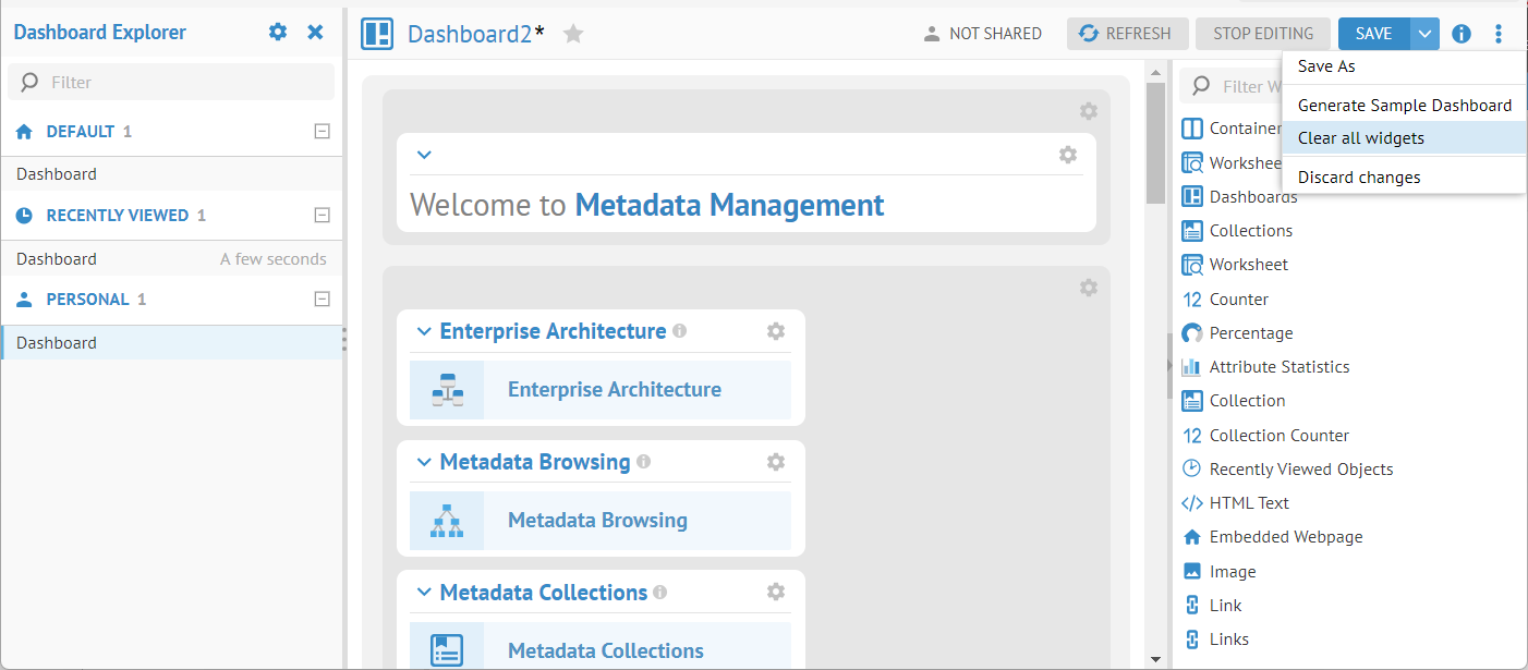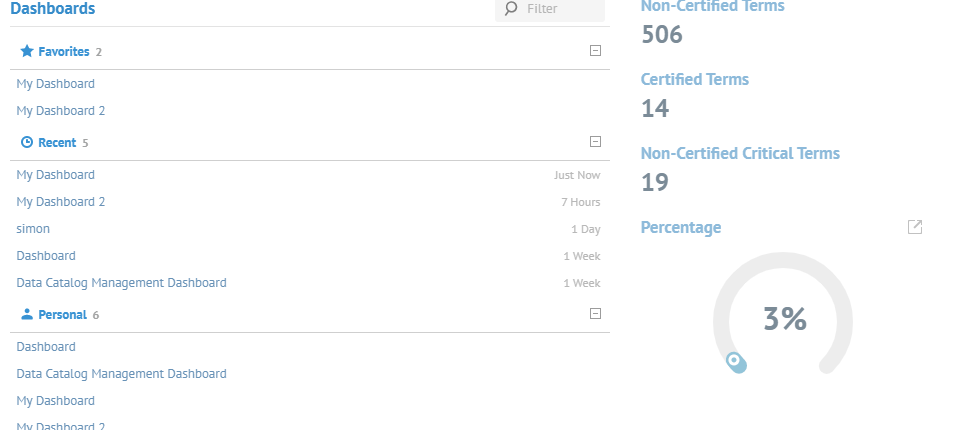 Dashboards are a way for you to completely customize the content presented on a page in MetaKarta. They have full BI reporting dashboard capabilities (tile layout, widgets for containers, numbers, statistics such as grids, bar or pie charts, etc.), but apply to the metadata in the repository, and are based upon Metadata Query Language (MQL) along with worksheets and collections.