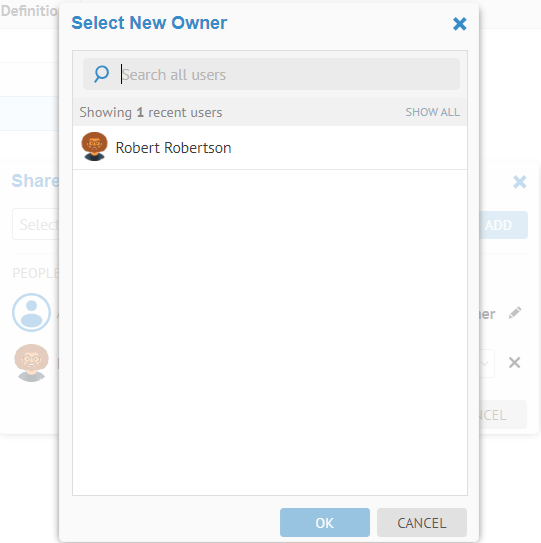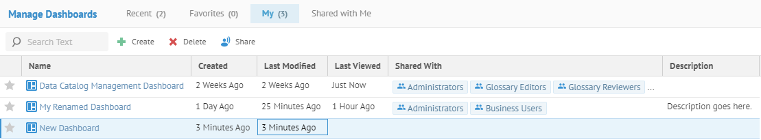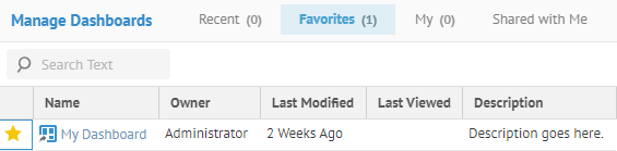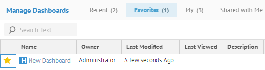 Go to DASHBOARDS > Manage. Click the Shared with Me tab. Click Search. Locate the New Dashboard. Click
