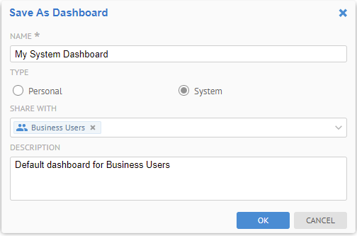 Open My Dashboard and click SAVE AS. Specify the name and other details as follows: