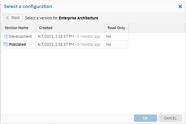 Select the Published configuration in the Demo Enterprise Architecture folder with a single-click this time and click CHOOSE VERSION.
