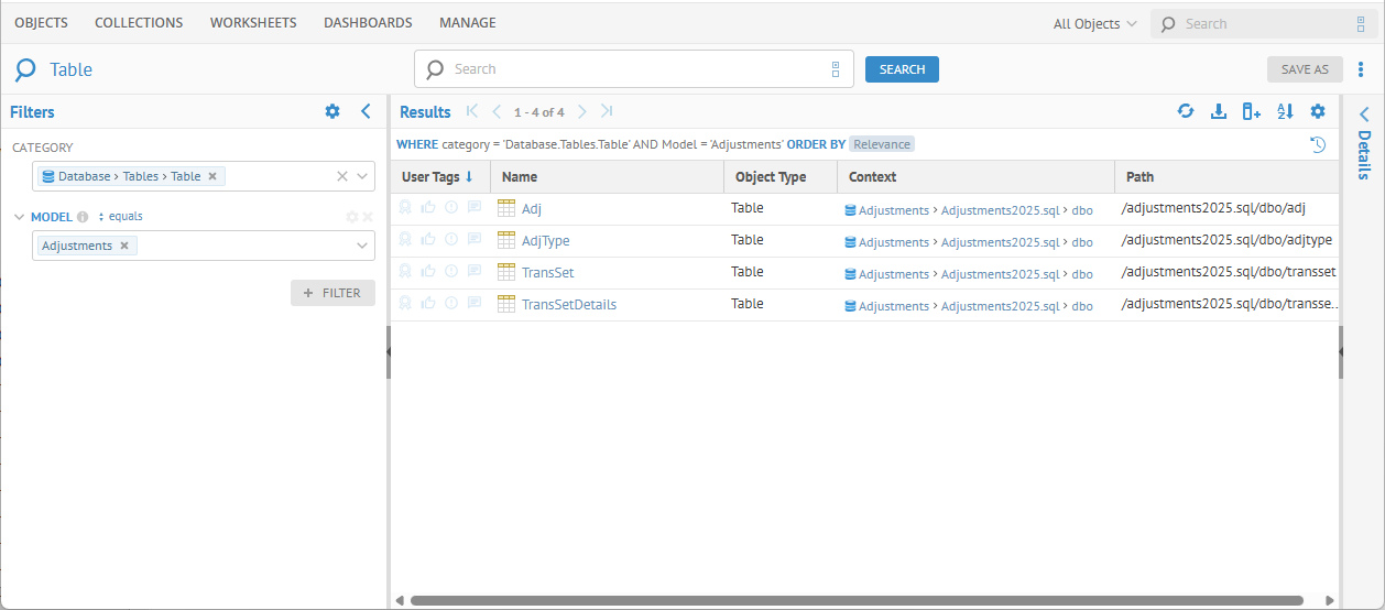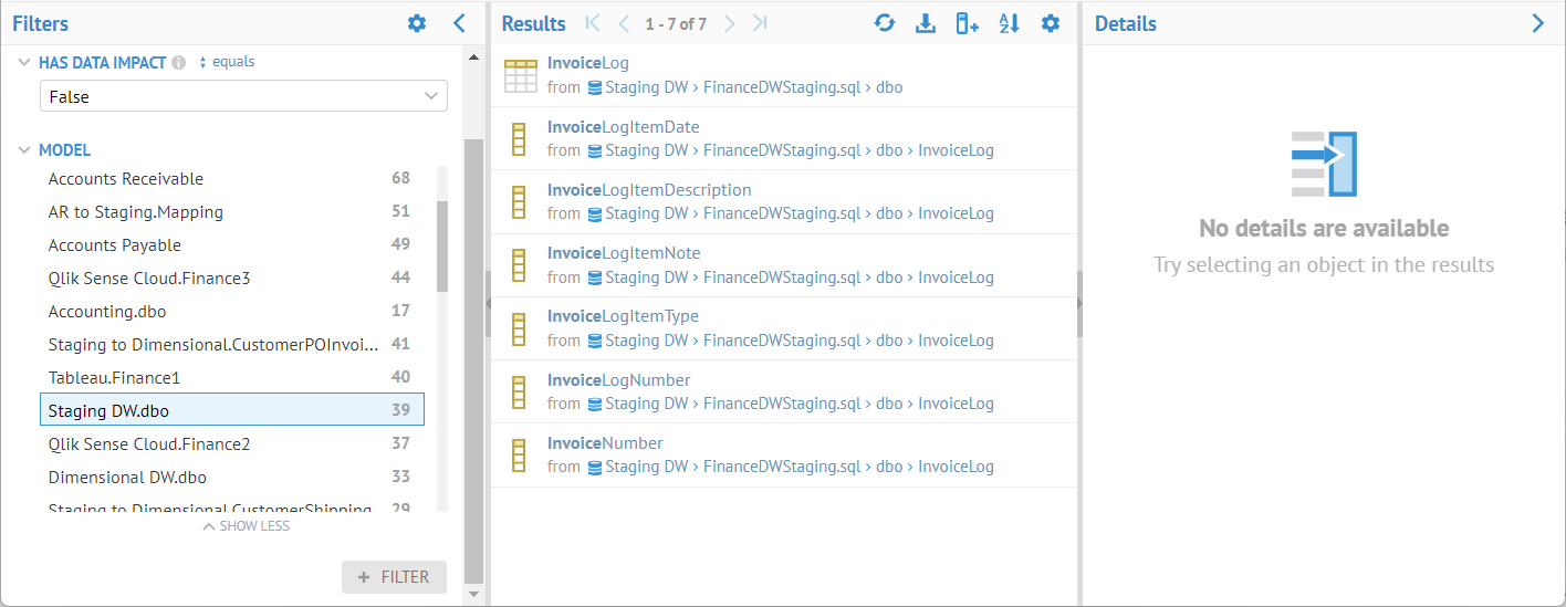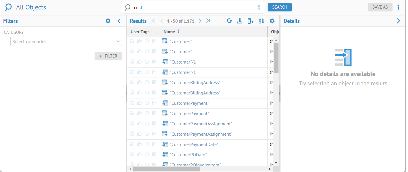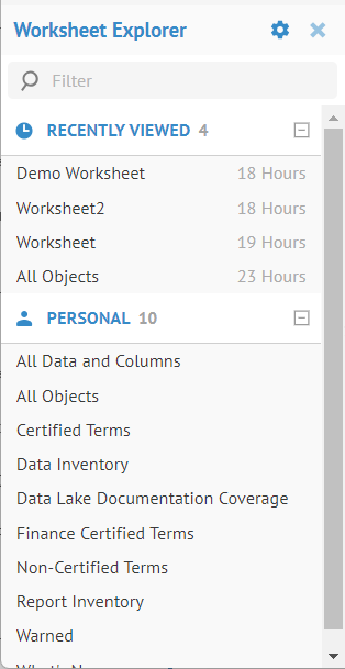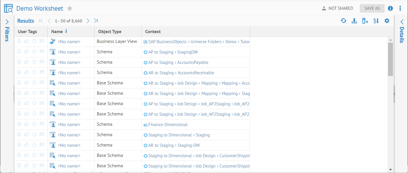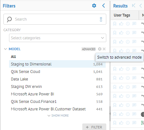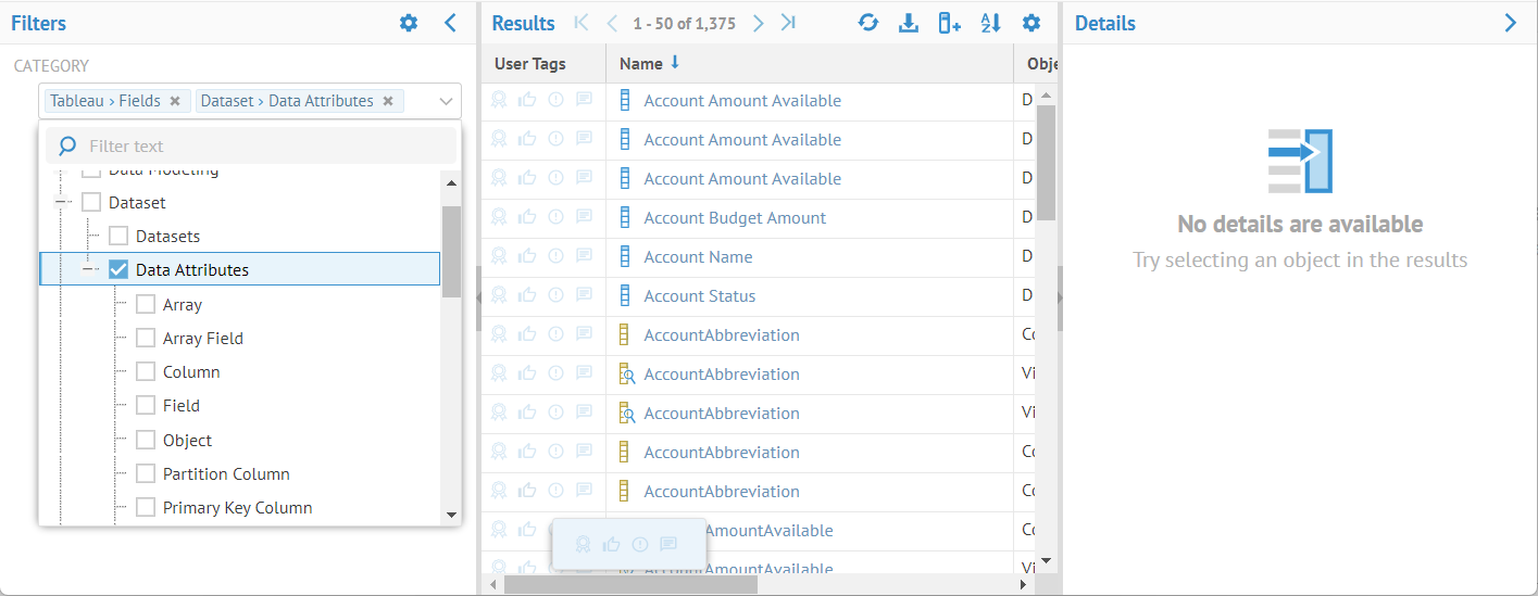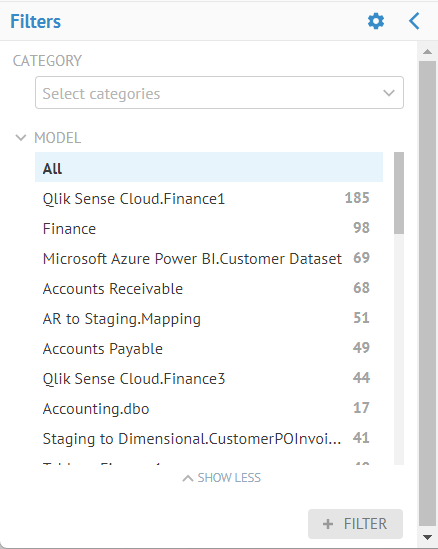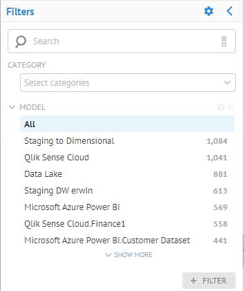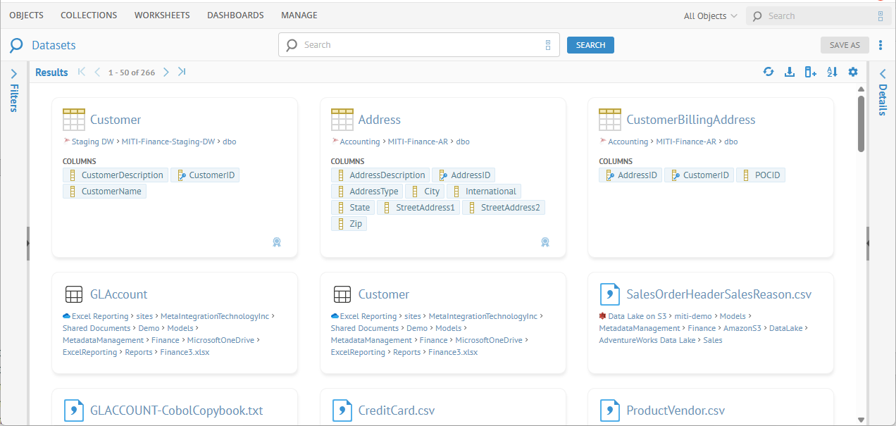 The worksheet capabilities offer you the ability to select multiple object types (e.g. database / tables + Flat files) and subset by model (My Data lake + Sales DW database) before drilling down with a large number of filters: