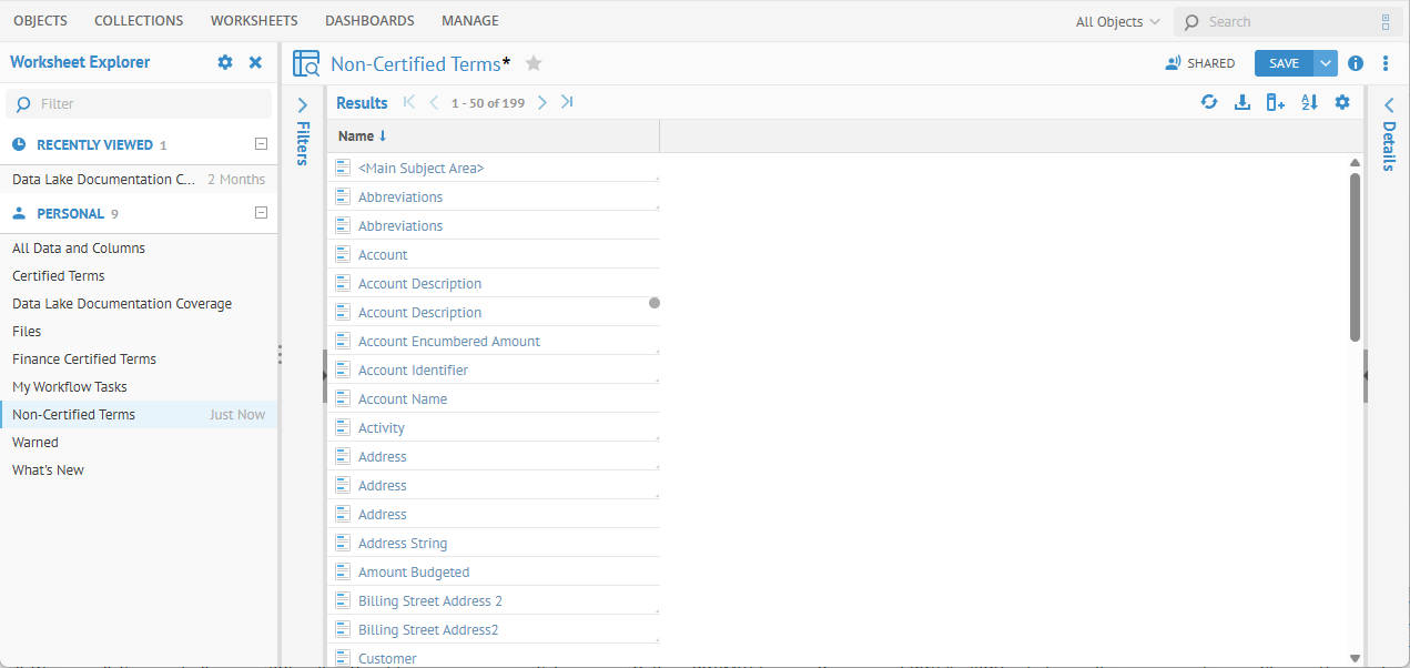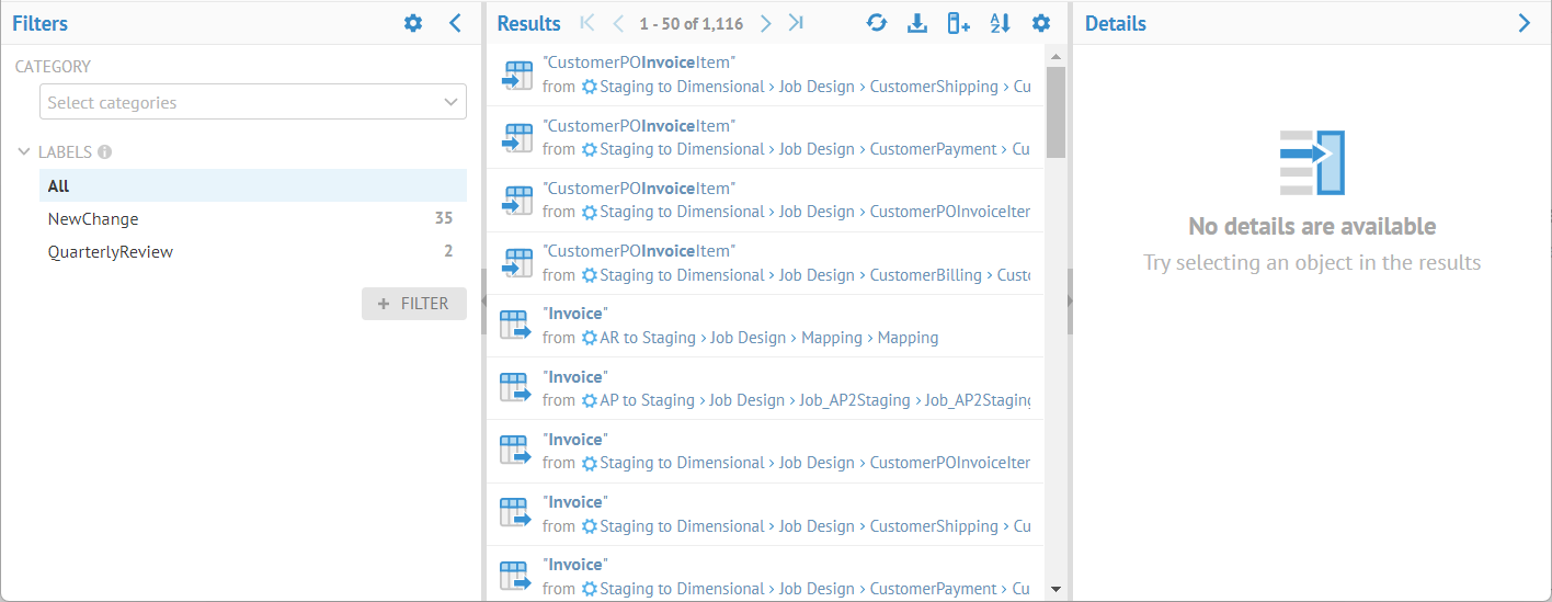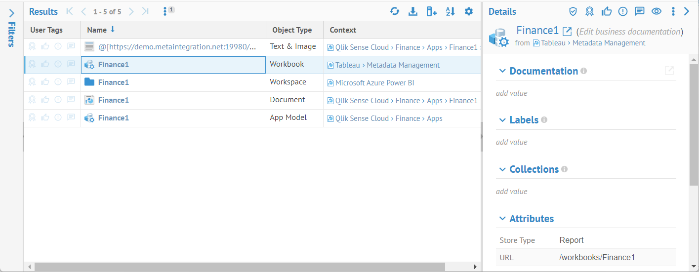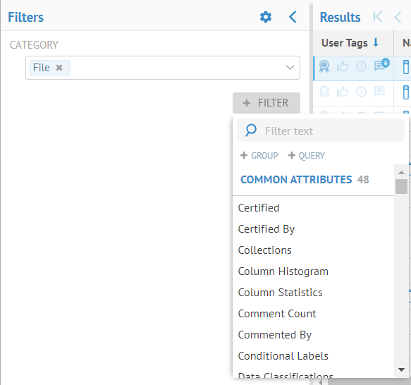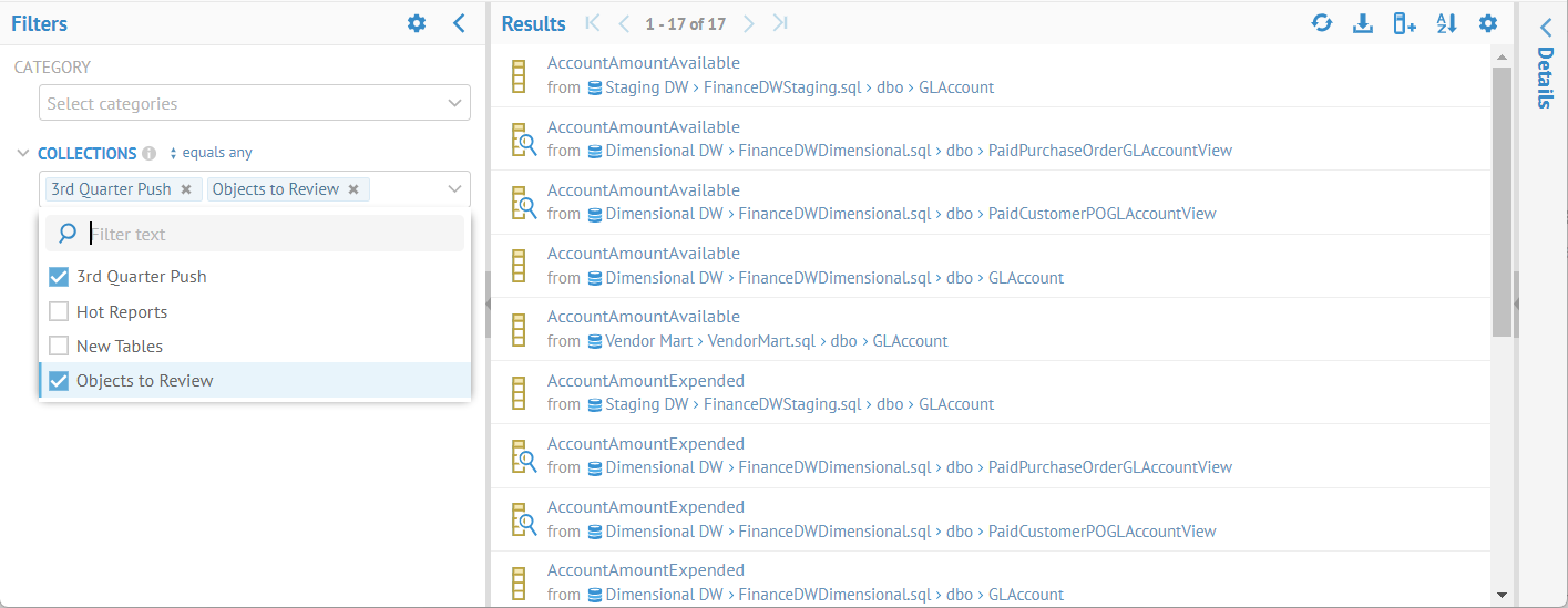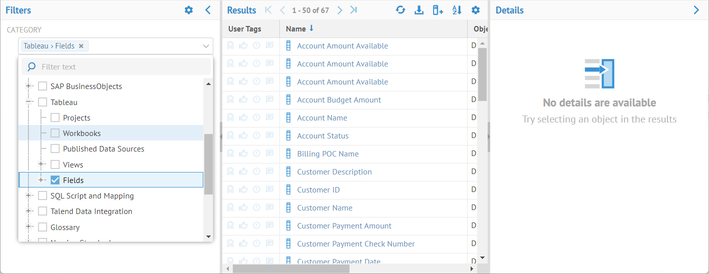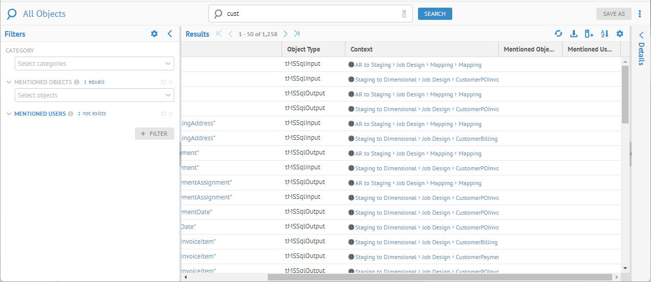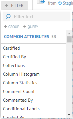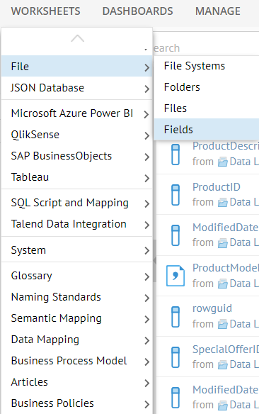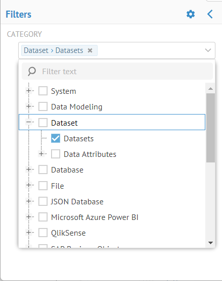 The worksheet capabilities offer you the ability to select multiple object types (e.g. database / tables + Flat files) and subset by model (My Data lake + Sales DW database) before drilling down with a large number of filters: