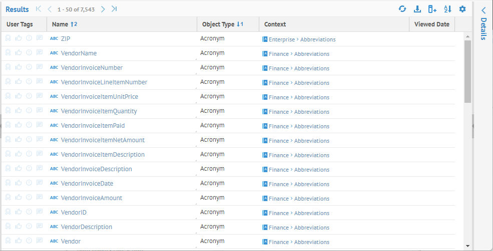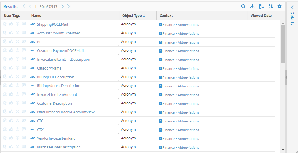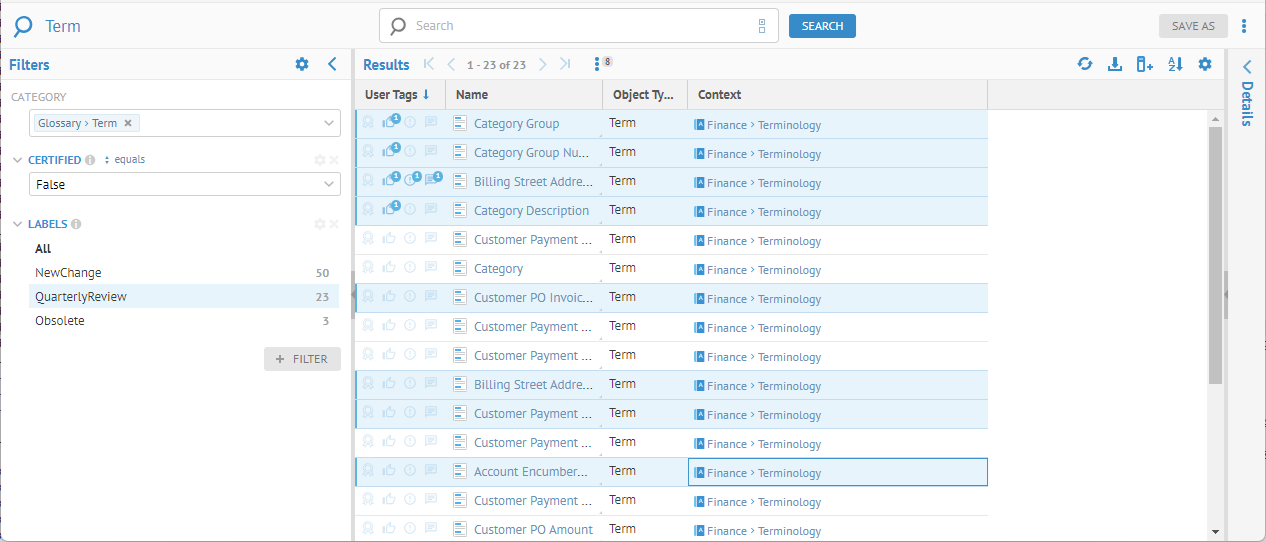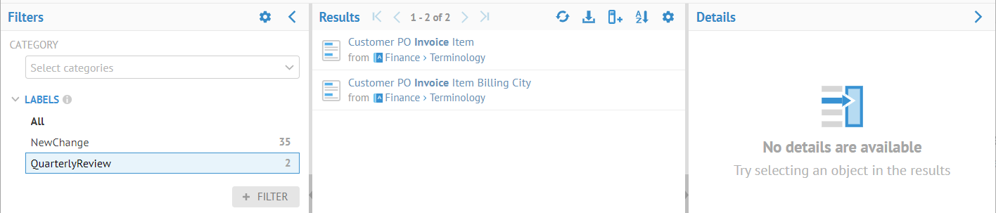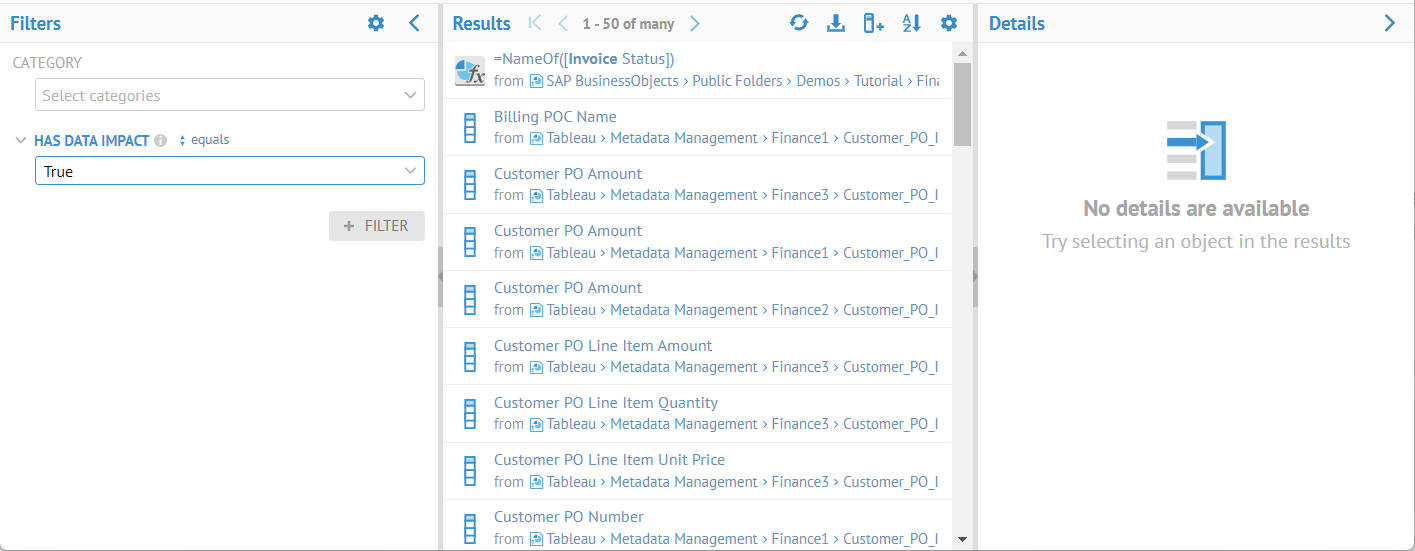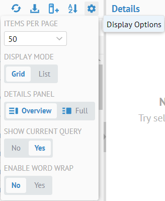 DETAILS PANEL to toggle between showing only the equivalent of the Overview tab of the object page or Full to show the entire object page for the selection in the Details panel (on the right).