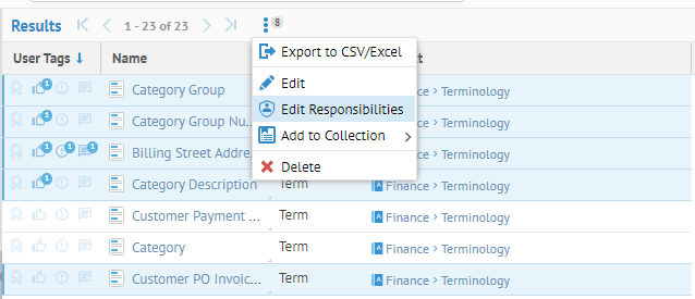 You may edit the object role responsibility assignments for multiple items in a worksheet. To do so, select multiple items and right-click one and select Edit Responsibilities.