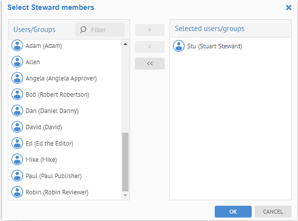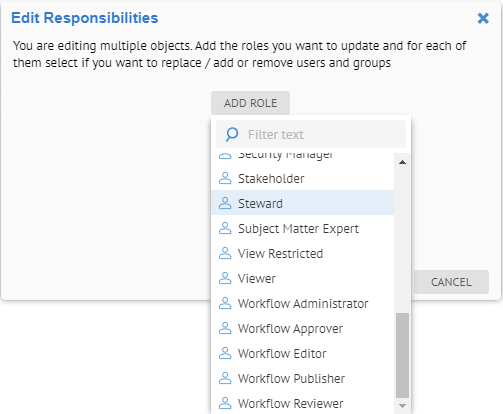 Bulk editing of stewardship is handled this way as stewardship is assigned via assignment of the Steward object role. In addition, in earlier versions of the production, stewards were the ones notified of changes to model. This is no longer the case. Instead, watchers are notified of changes to models when enabled. The migration from stewards to watchers is performed automatically on upgrade from previous versions and thus all stewards become watchers.