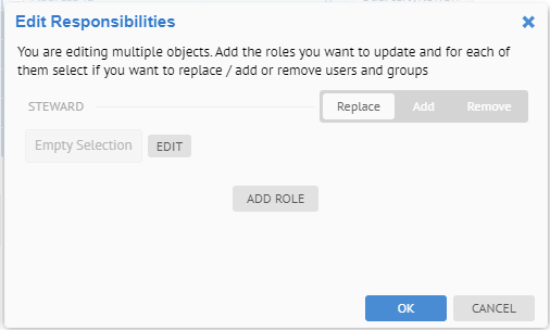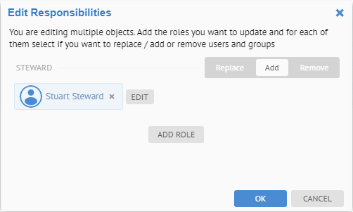 As you are editing multiple objects and multiple responsibilities, any changes you make will apply identically to ALL the objects. However, you may control whether the new role assignment replaces, extends for removes a current role assignment.