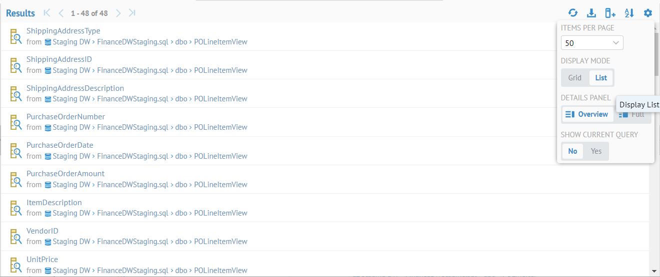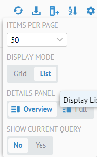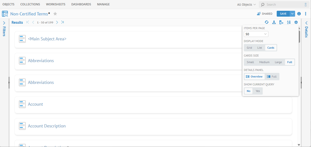 DISPAY MODE to toggle among the List mode (with name and definition) the Grid mode (allowing multiple header columns and sort order by column) and the Card mode (individual cards for each object along with property values for each header column)