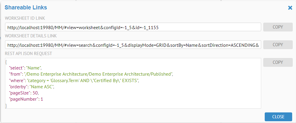 Worksheets can be reused and shared using the Share functionality. However, one may also do so by saving the URL as favorites (further versions will support full report management within the application).