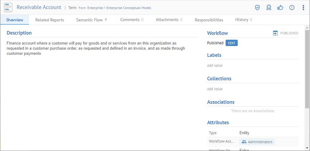Go back to the Overview tab and note that the Enterprise glossary is under workflow. Thus, click EDIT and leave a comment, and click OK.