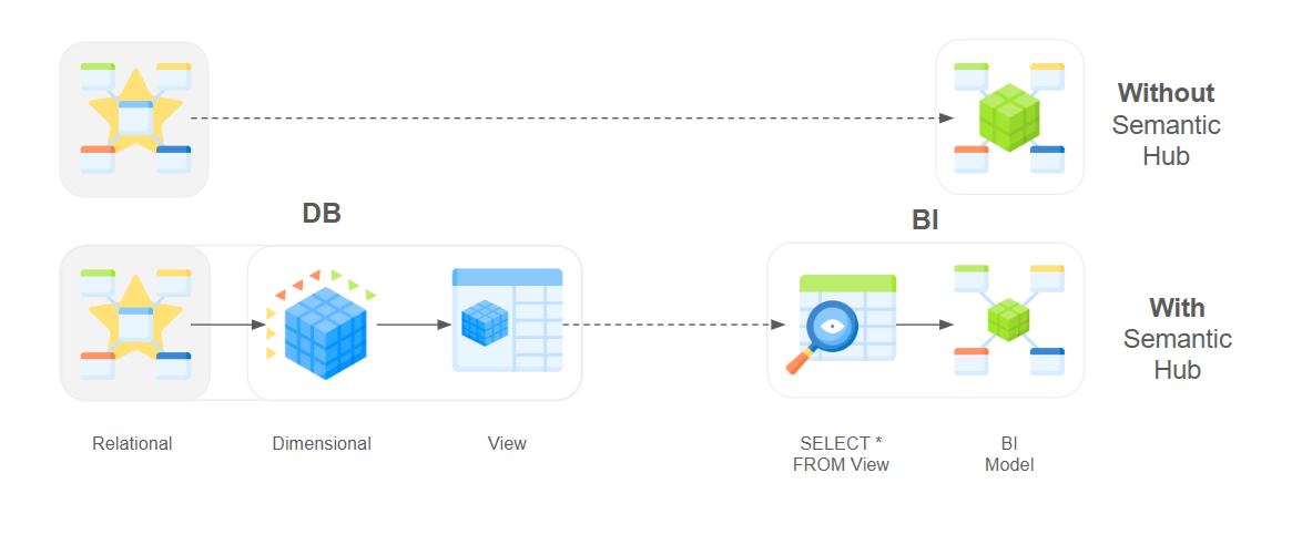 - Enable a Business Analyst to translate raw data into business concepts, like metric, dimension, hierarchy, and standardize them in database semantic layers to make it available to: