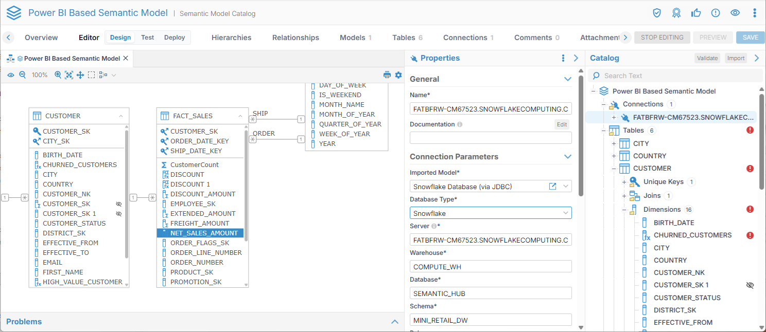 Now it is time to deploy the semantic model to Snowflake. In this case, {{ MIMM }} will connect to Snowflake using connection information from an already imported model (from Snowflake) and generate a semantic view to query against.