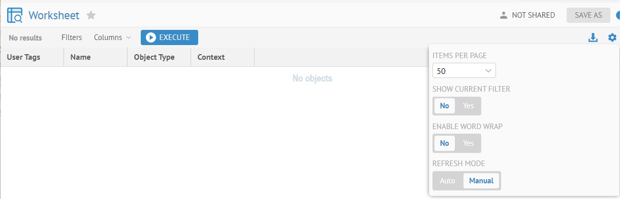 | Worksheet Maximum number of objects per Page | Maximum number of objects which may be presented on one page of the results. |