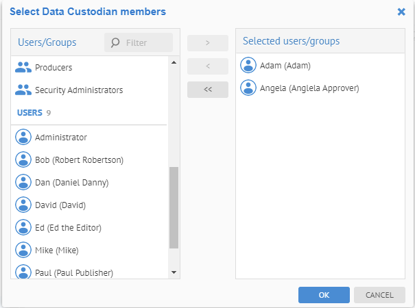 To complete the responsibility assignment, pick Adam and Angela to be Content Custodians for Staging DW.