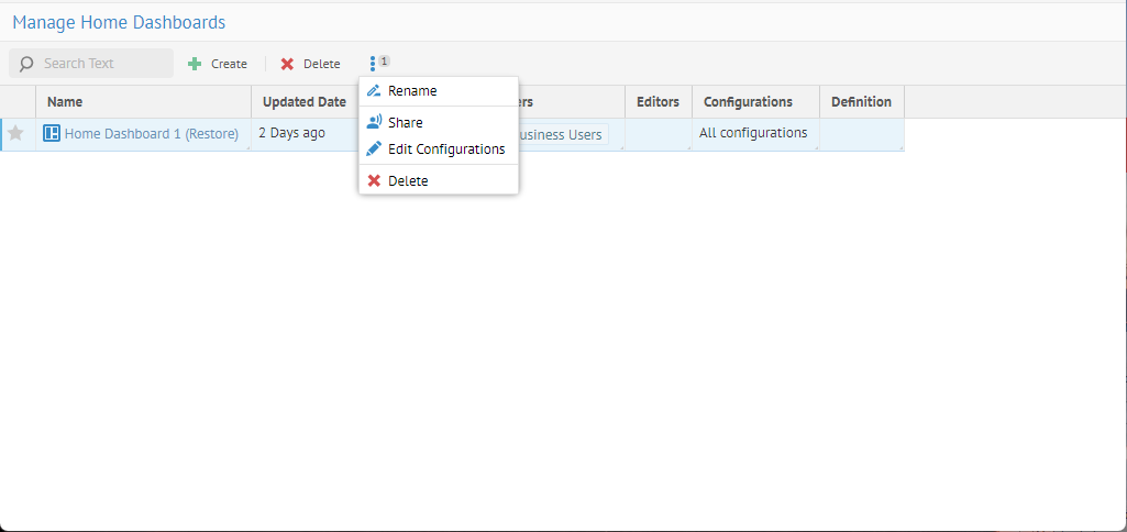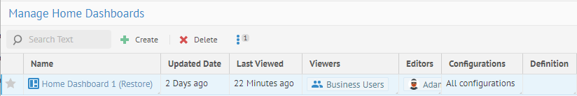 Double-click in the Configurations cell for the row containing the default dashboard.