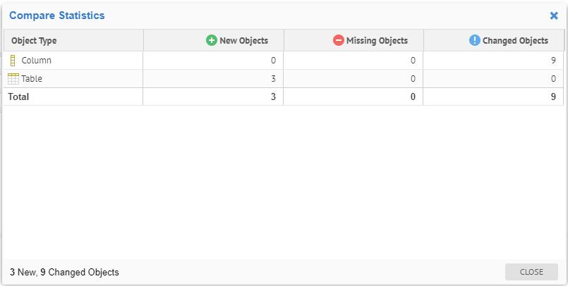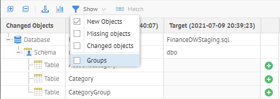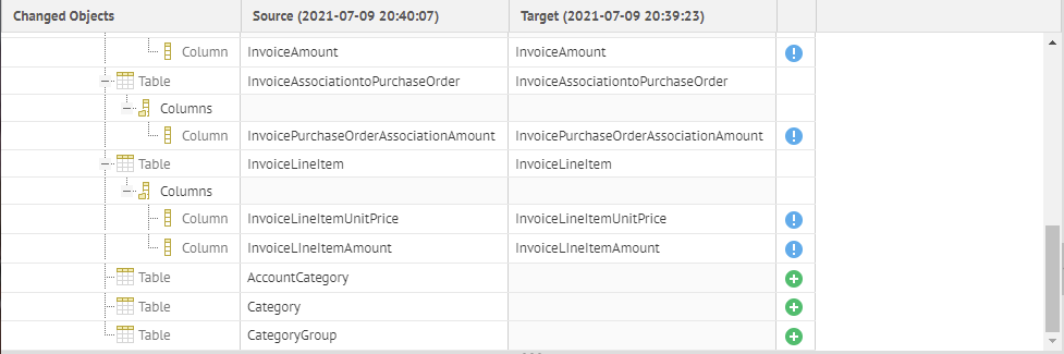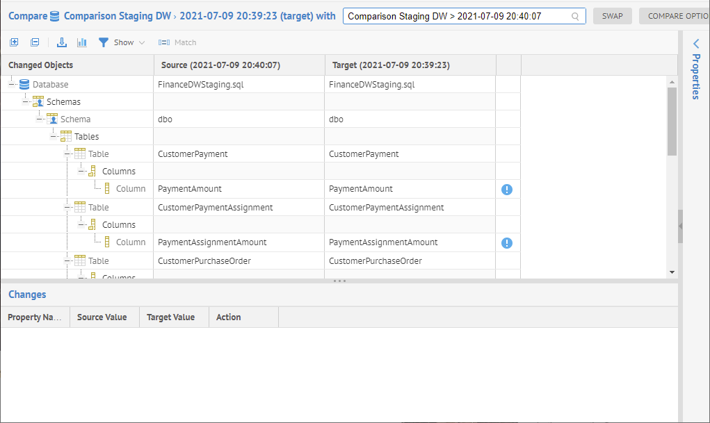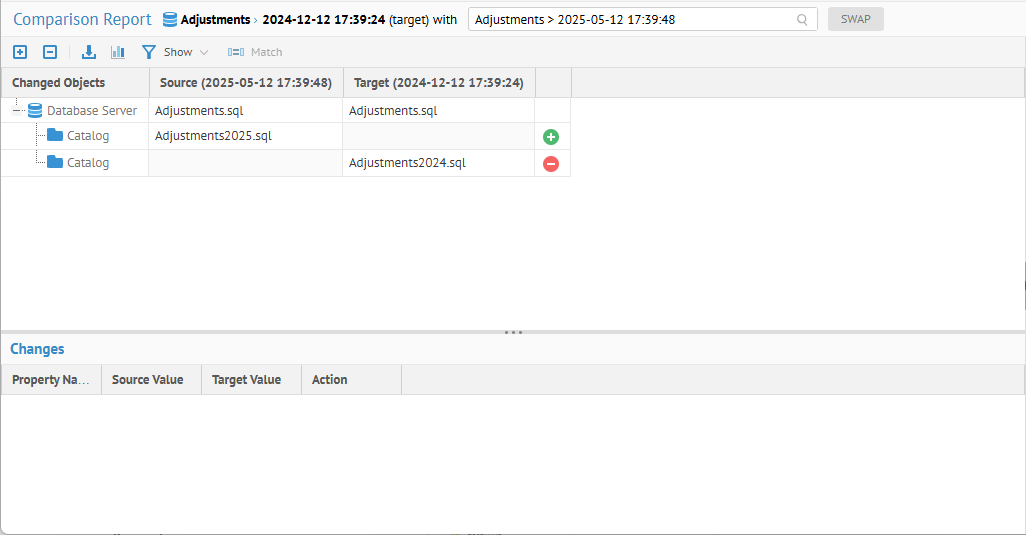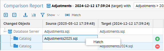 Note, there are two Catalog level objects with names based upon the year they were valid for. Unfortunately, this difference in name means that the comparison reports that these are two separate objects and does not try to compare their contained objects. You may select both rows (Adjustments2025.sql and Adjustments2024.sql) and the right-click and select the Match option to inform the comparator that they should be treated as equivalent and thus perform the comparison on the contained objects (e.g., tables in the schema).