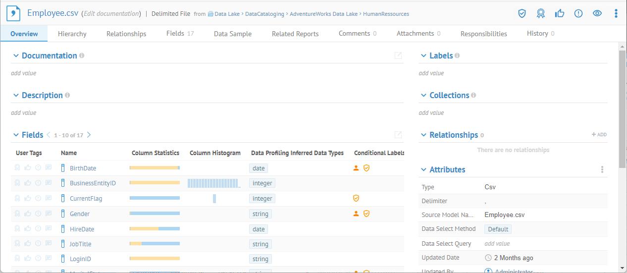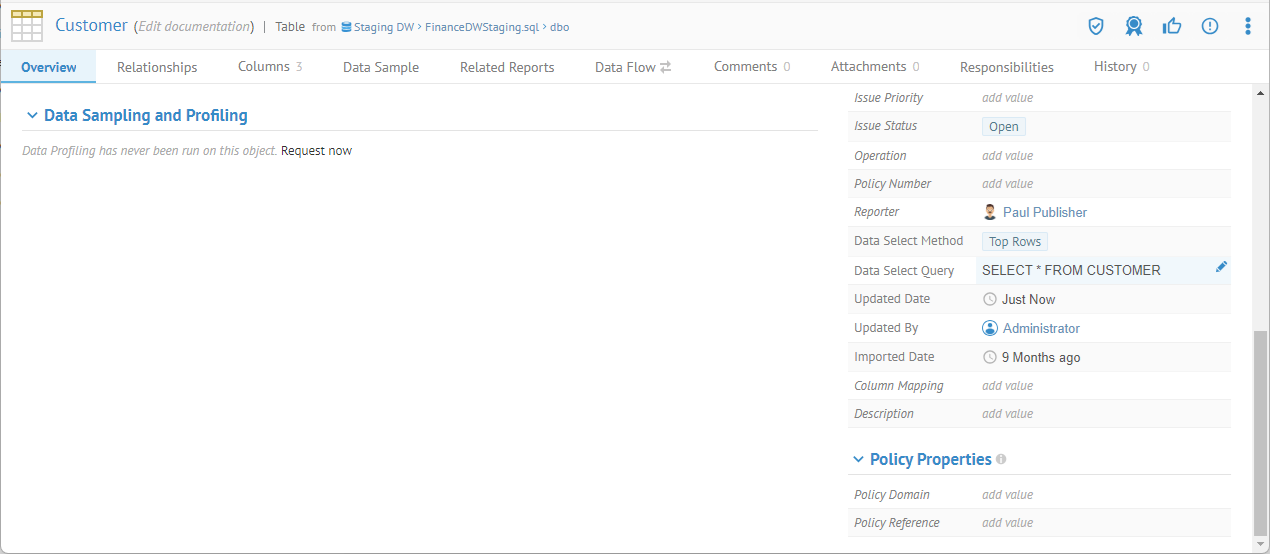 That information is then available when one navigates to the file or table's object page or when looking at individual fields or columns from the file or table. The application can store and display the following data profiling details for table/view and column objects: