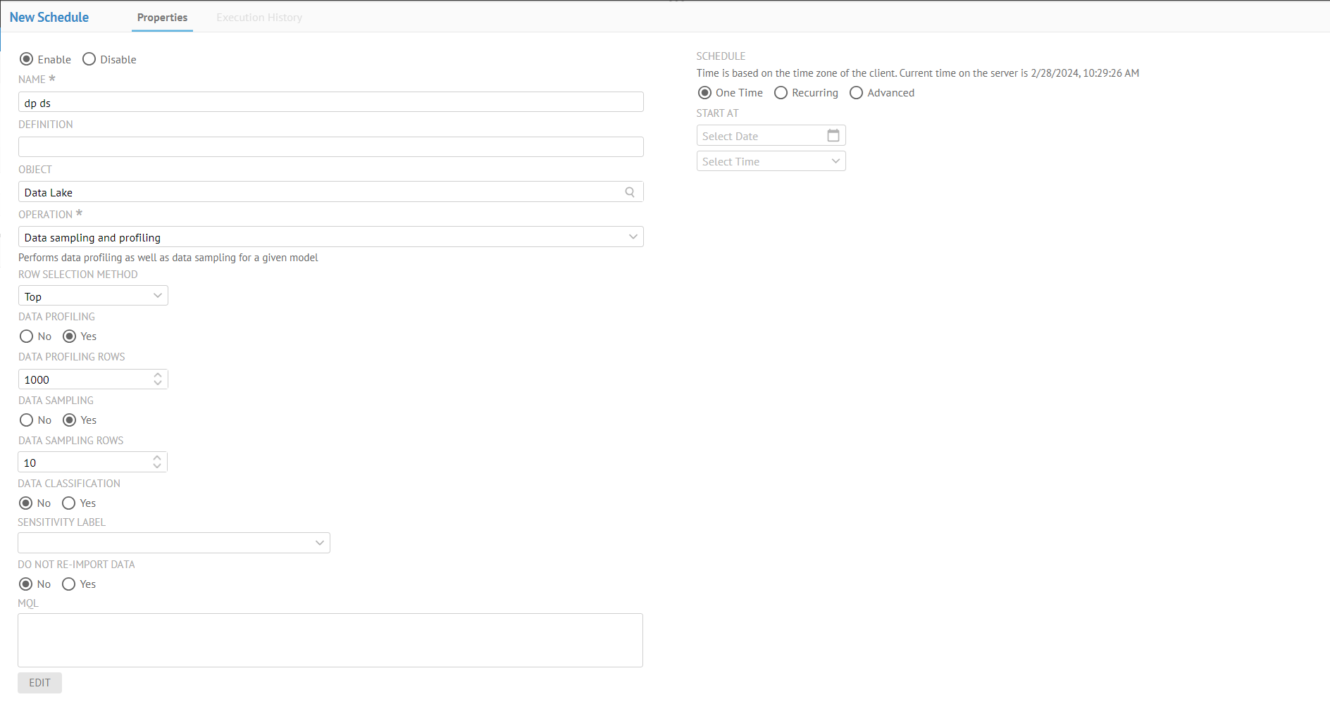 Sign in as Administrator and go to MANAGE > Schedules. Click create new. Provide "S and P" as the NAME. Specify the model to sample as the OBJECT. Select Data sampling and profiling as the OPERATION. Specify the other profiling and sampling options.