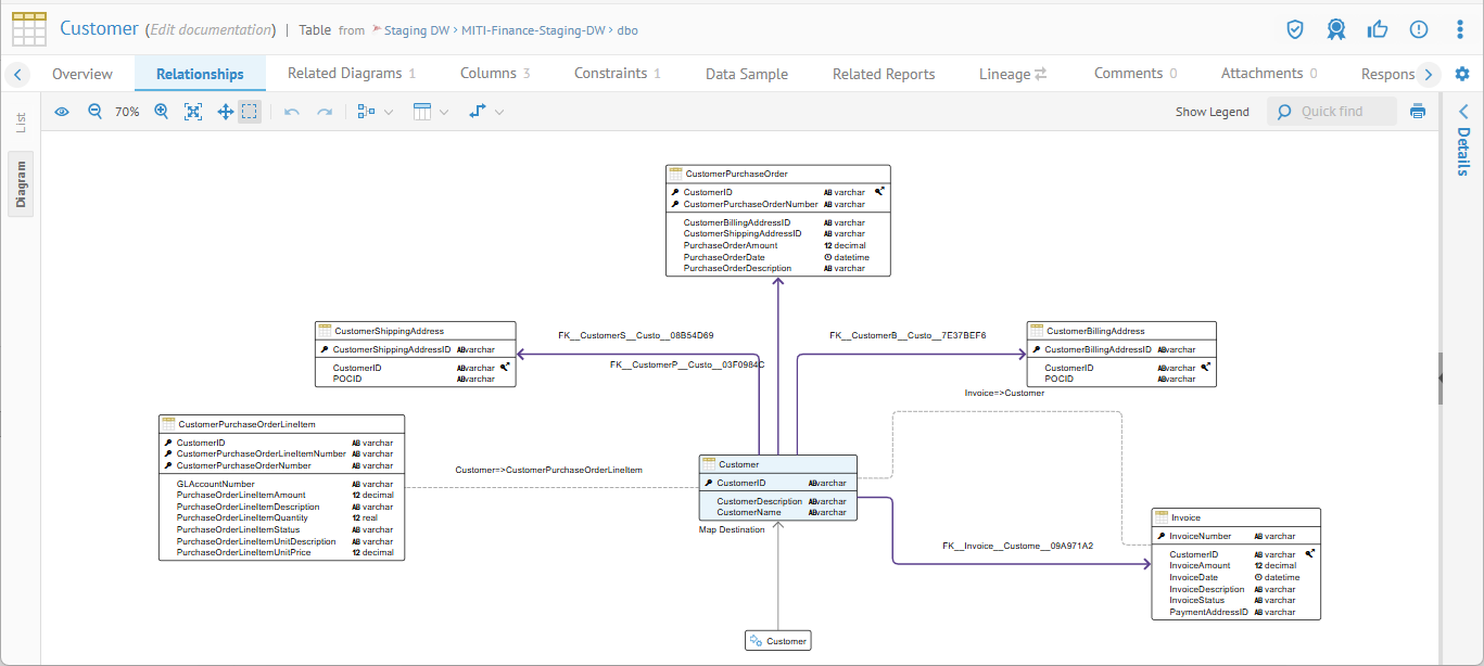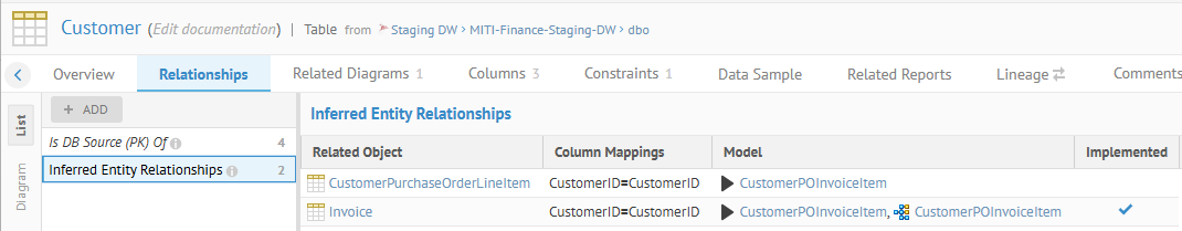 In this case we will navigate to the object page of the Customer table in the Staging DW database model, and click the Relationships tab.