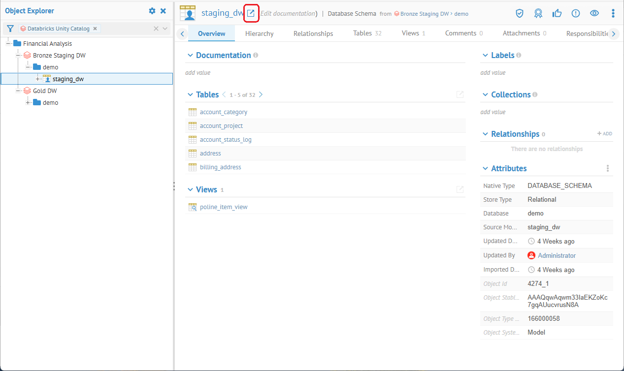 In the Cloud Databricks Architecture configuration, we can see Databricks based models, e.g., the Bronze Staging DW Databricks model containing a schema named staging_dw: