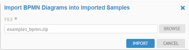 Go to More Actions... > Import BPMN Diagrams, pick the file from the demo sample files at Models\BPMN\examples_bpmn.zip. Click IMPORT.