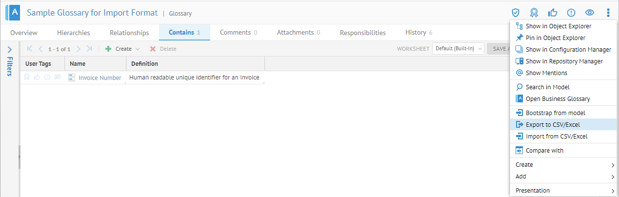 The first four fields should map into the standard Glossary Term quite well. However, the Subject Matter Expert Certification will need to be defined in the metamodel and Term should be extended to include it. Alternatively, one could create a new object type (say External Term) that inherits from Glossary > Term and also includes the new attribute. We will do the former.
