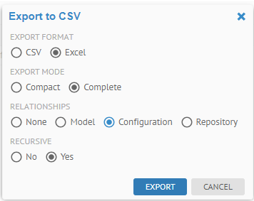 The bulk import and export is a context menu option on a folder in the repository manager. The export process produces an XLSX file per a single-model. When bulk exporting multiple models, it ZIPs their XLSX or CSV files organized by their folder hierarchy using file directories. The import process takes a ZIP file and assumes the same organizational structure as the export process.