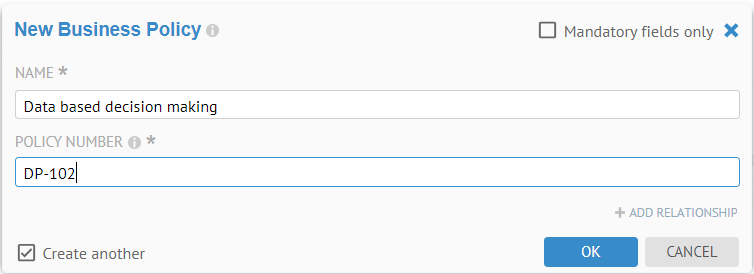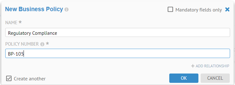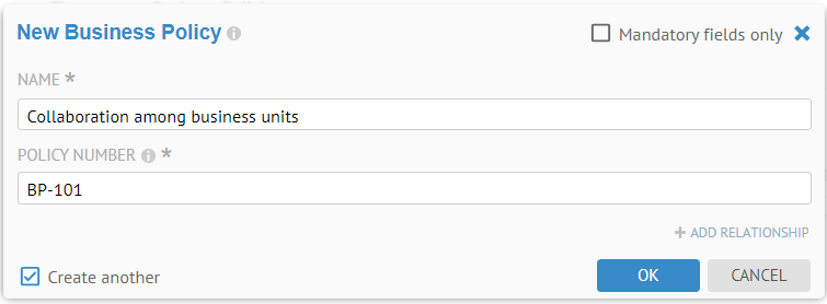 Uncheck the Mandatory fields only checkbox and enter "Collaboration among business units" in the NAME and "BP-101" in the POLICY NUMBER. Then, check the Create another checkbox.