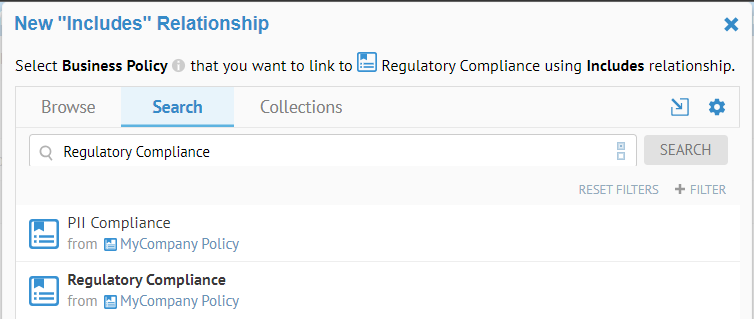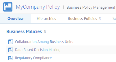 Let's make some of these connections with the two instantiated models we have (MyCompany Policies and MyCompany Business Rules).