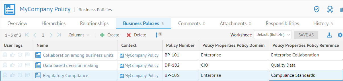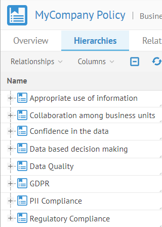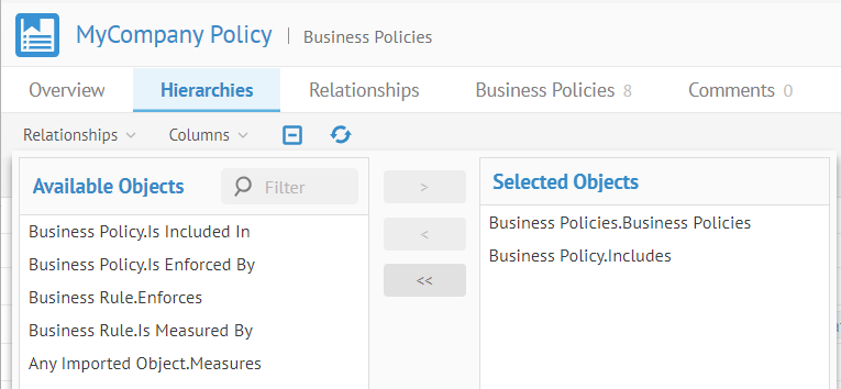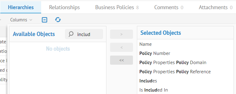Now, click MyCompany Policy in the breadcrumbs at the top and go to the Hierarchies tab and click Columns to add the various attributes defined for the business policies as shown.