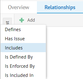 Go to the Relationships tab, click List on the left tab. Click +ADD and select Includes.