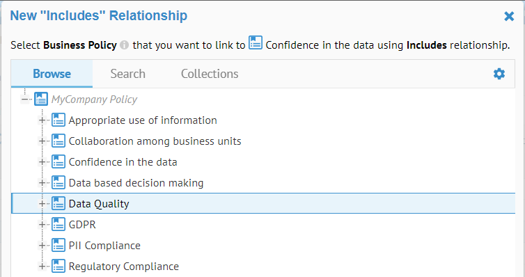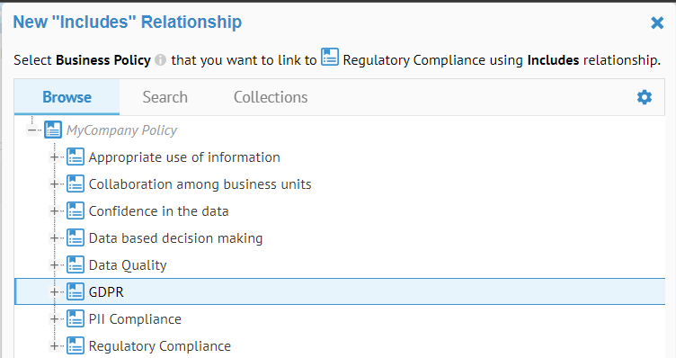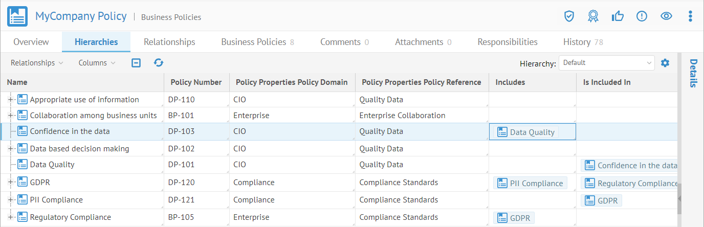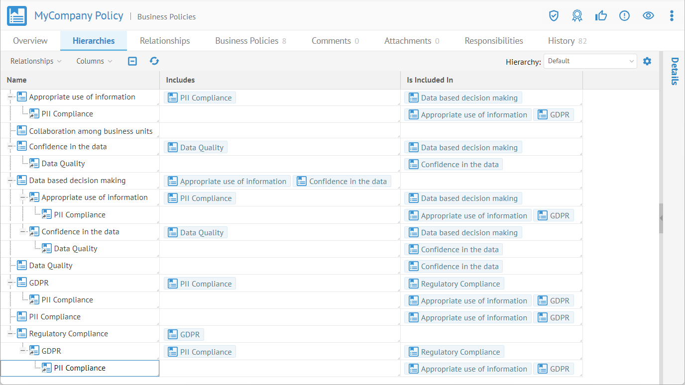 Now, this includes relationship is represented as a hierarchy so you may visualize how policies are included within others. E.g., PII Compliance is included in GDPR and also in Appropriate use of information.