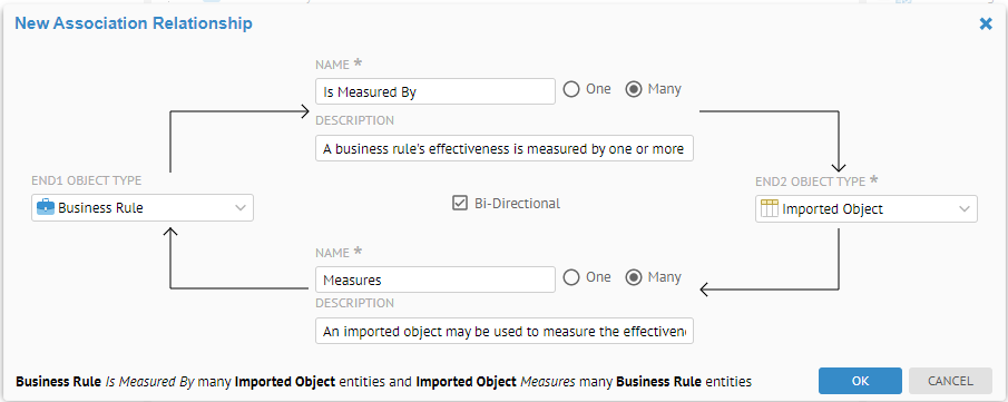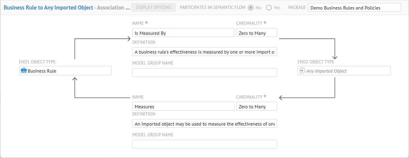 As we can see from the MANAGE > Metamodel page, there is an association between the two different models for business rules and an imported model.