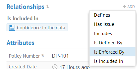 On the object page of MyCompany Policy, click Data Quality to go to its object page and click +ADD to the right of Relationships.