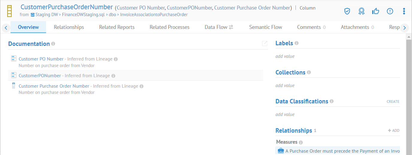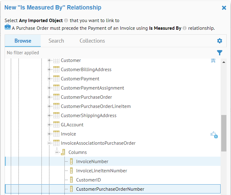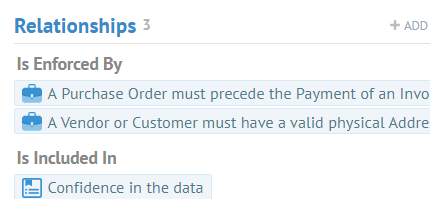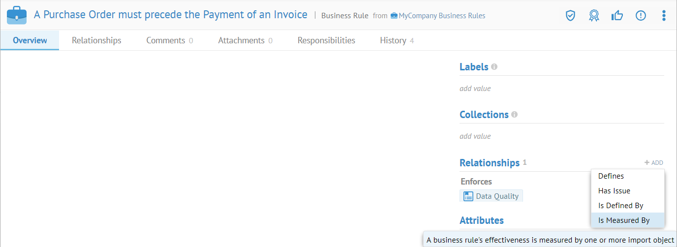 On the object page of MyCompany Business Rules, click A Purchase Order must precede the Payment of an Invoice to go to its object page and click +ADD to the right of Relationships and select is Measured By.