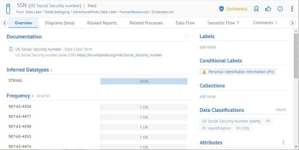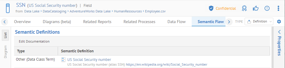 The SSN field is assigned the US Social Security Number data class. Thus, the Name and Business Definition are populated with the information of the SSN term.