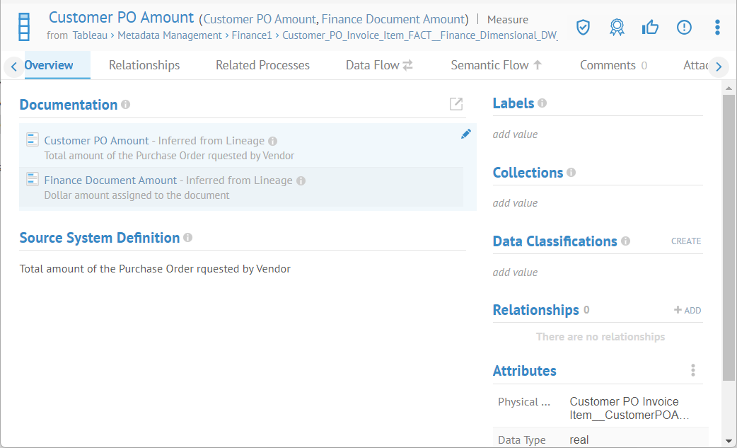 Navigate to the object page for the column Customer PO Amount in the Tableau report at Tableau > Metadata Management > Finance1 > Customer_PO_Invoice_Item_FACT__Finance_Dimensional_DW_ > Customer PO Invoice Item.